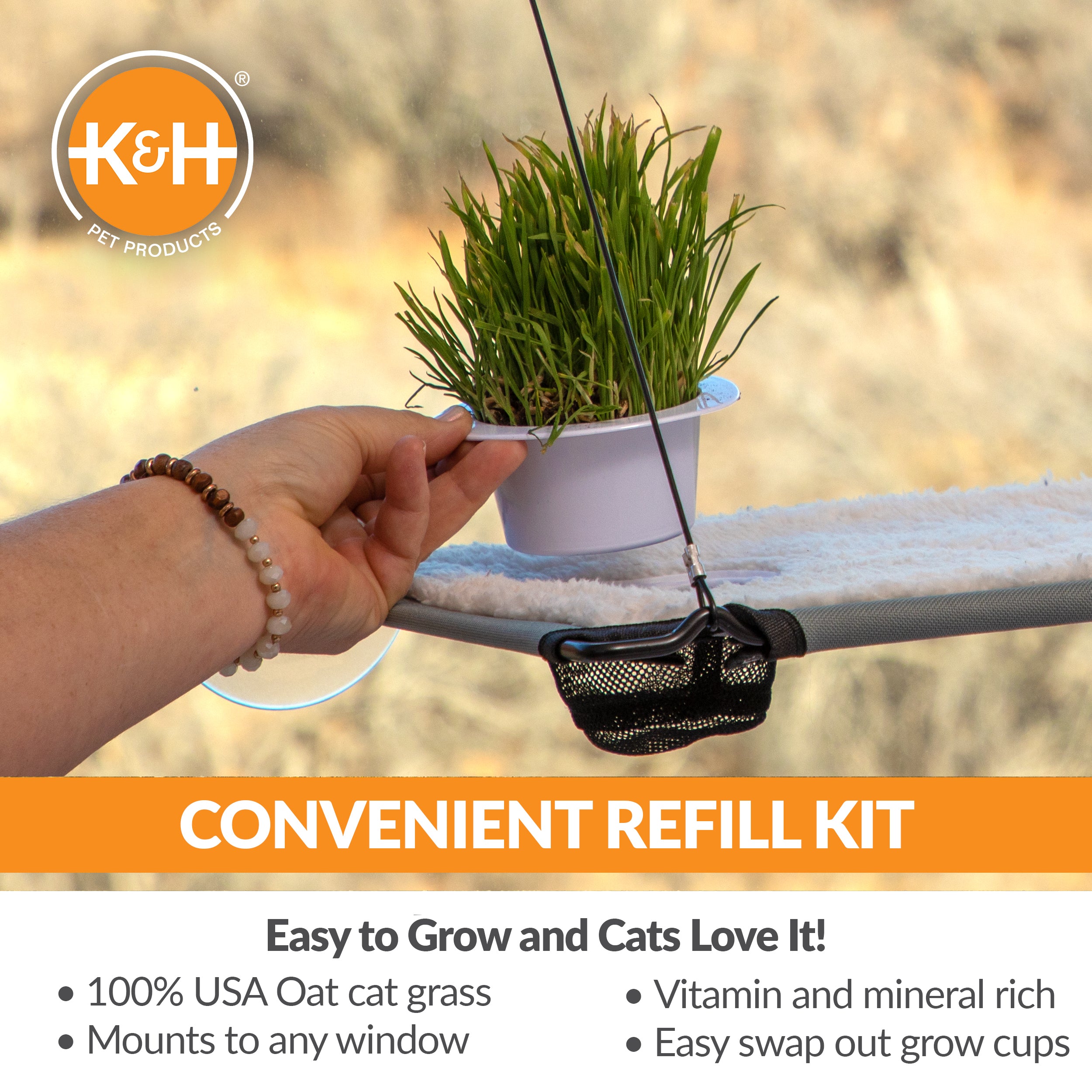 Convenient refill kits fit all K&H Cat Grass Grow Station products; cat grass refills include 2 grow cup kits for easy swapping, and are all-inclusive for immediate cat grass growing