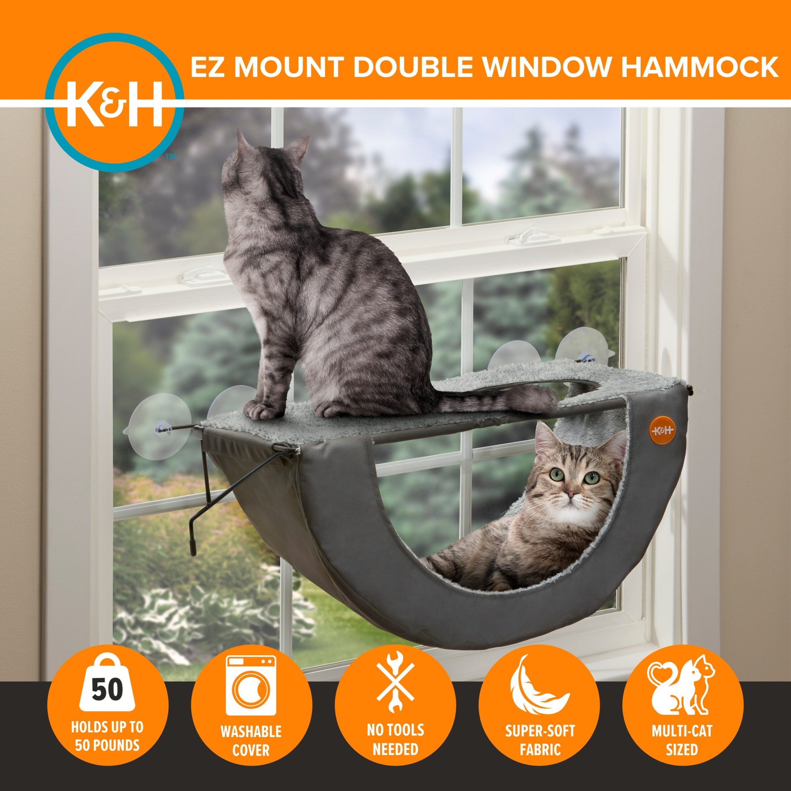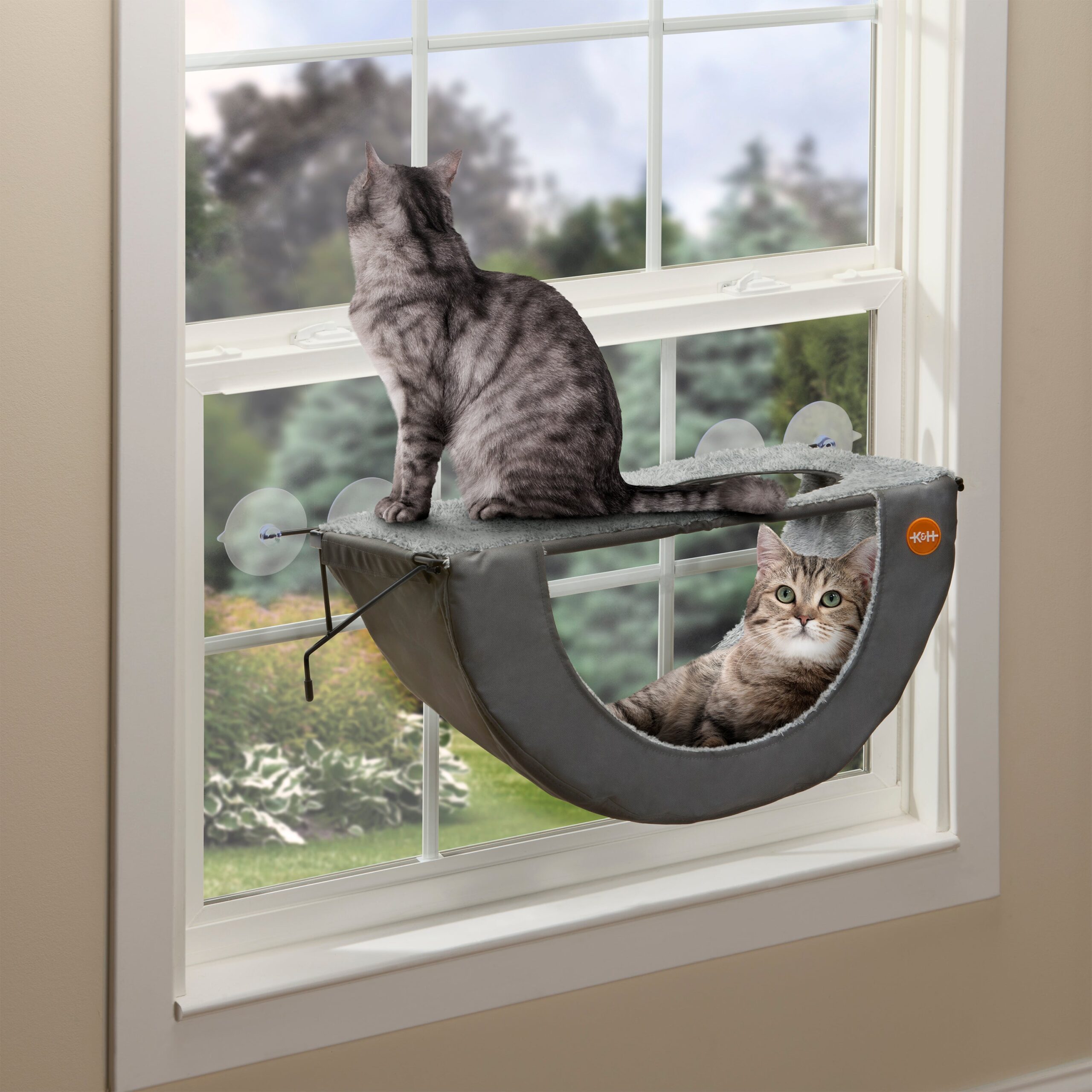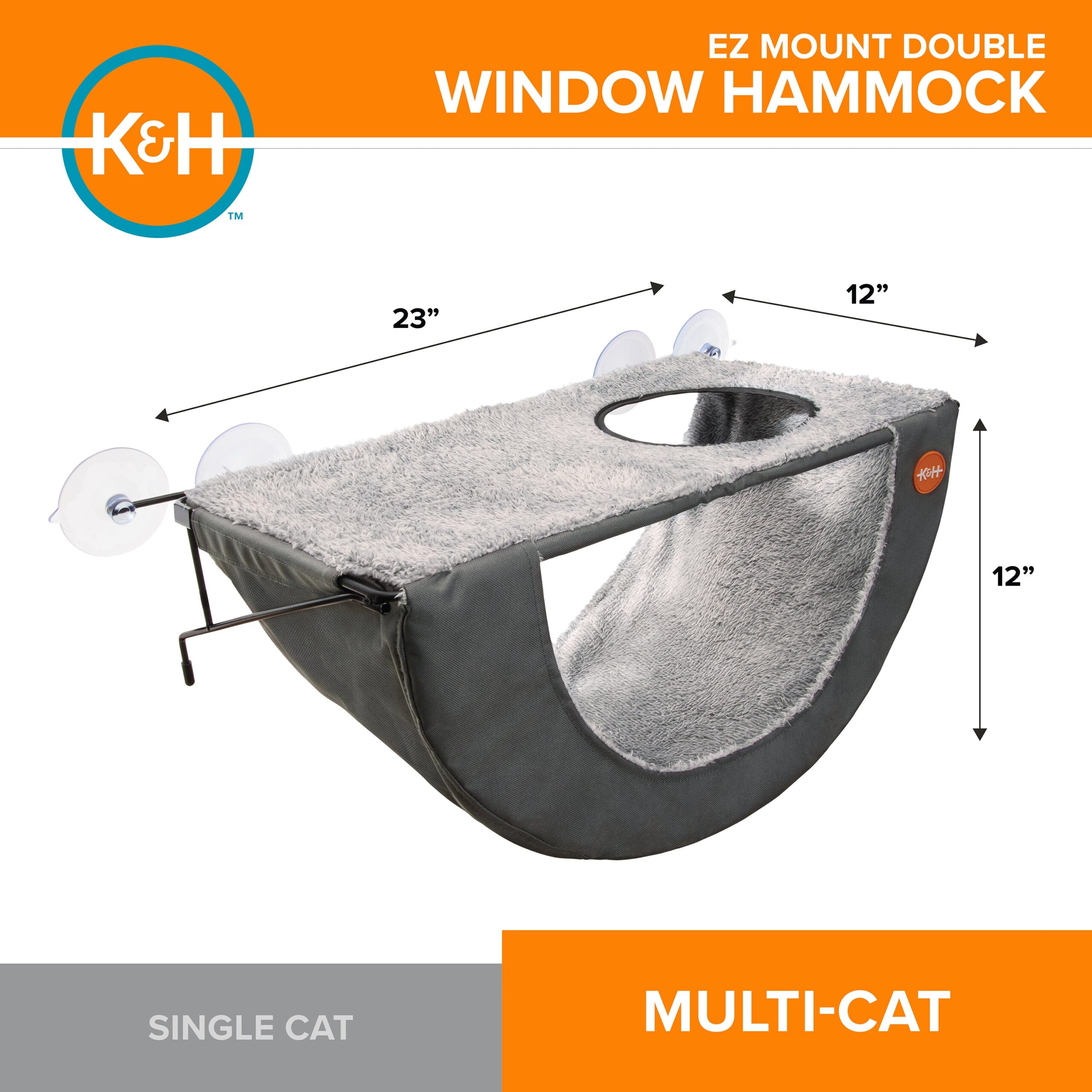 Cordless 2-level cat window perch bed features a true hammock design to cradle your kitty in pressure-relieving comfort; cord-free, and tool-free installation; mounted kitty sill measures 29”L X 13.5”W X 12”H including suction cups