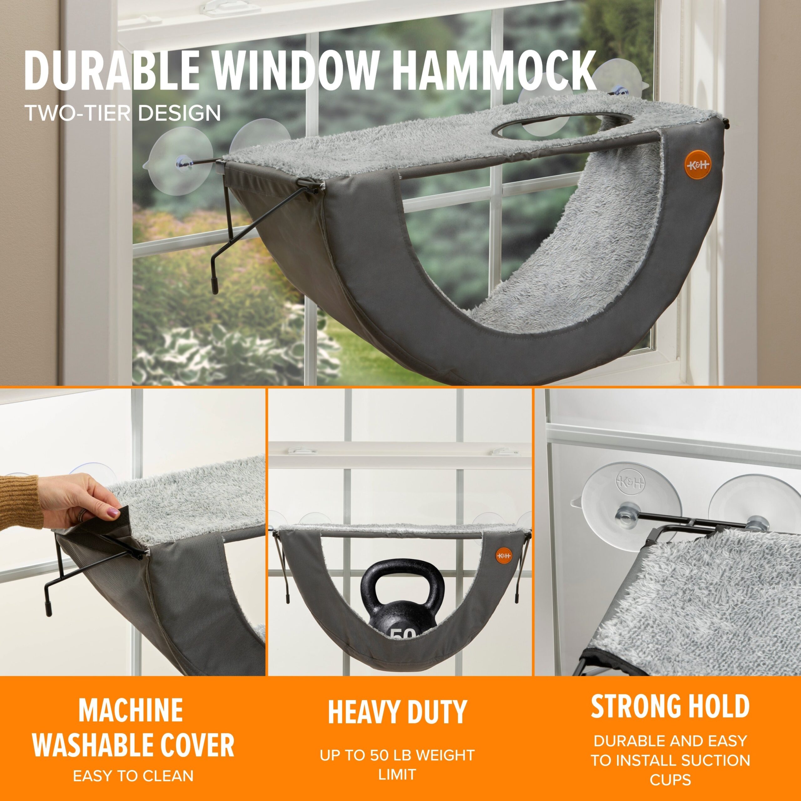 This multi-level cat window perch features a durable steel frame and heavy-duty suction cups supporting up to 50 lbs, ideal for large cats and multiple cats; provides a cozy, secure space to soak up warm sunlight and enjoy bird-watching