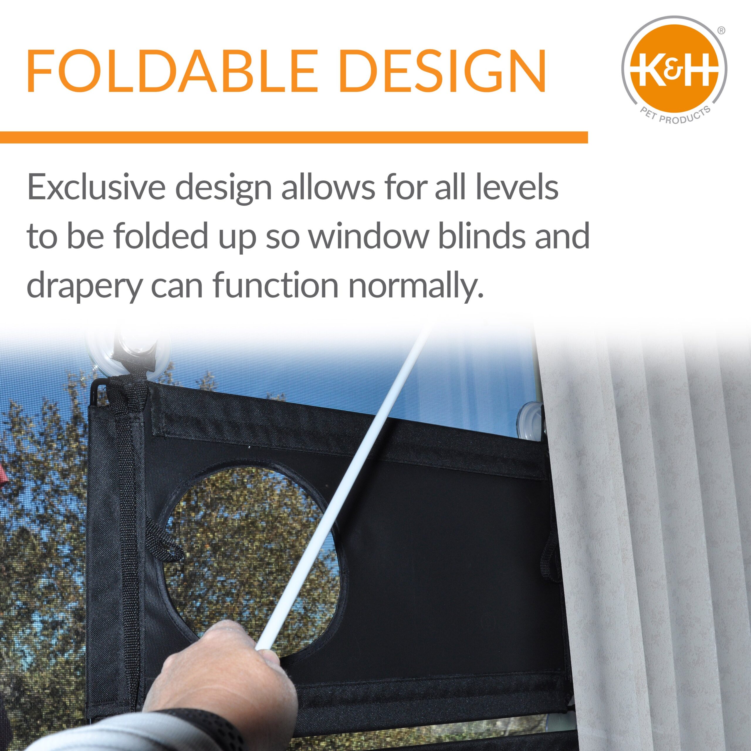 Folds up to window so blinds and drapery can function normally (if kitty lets you)