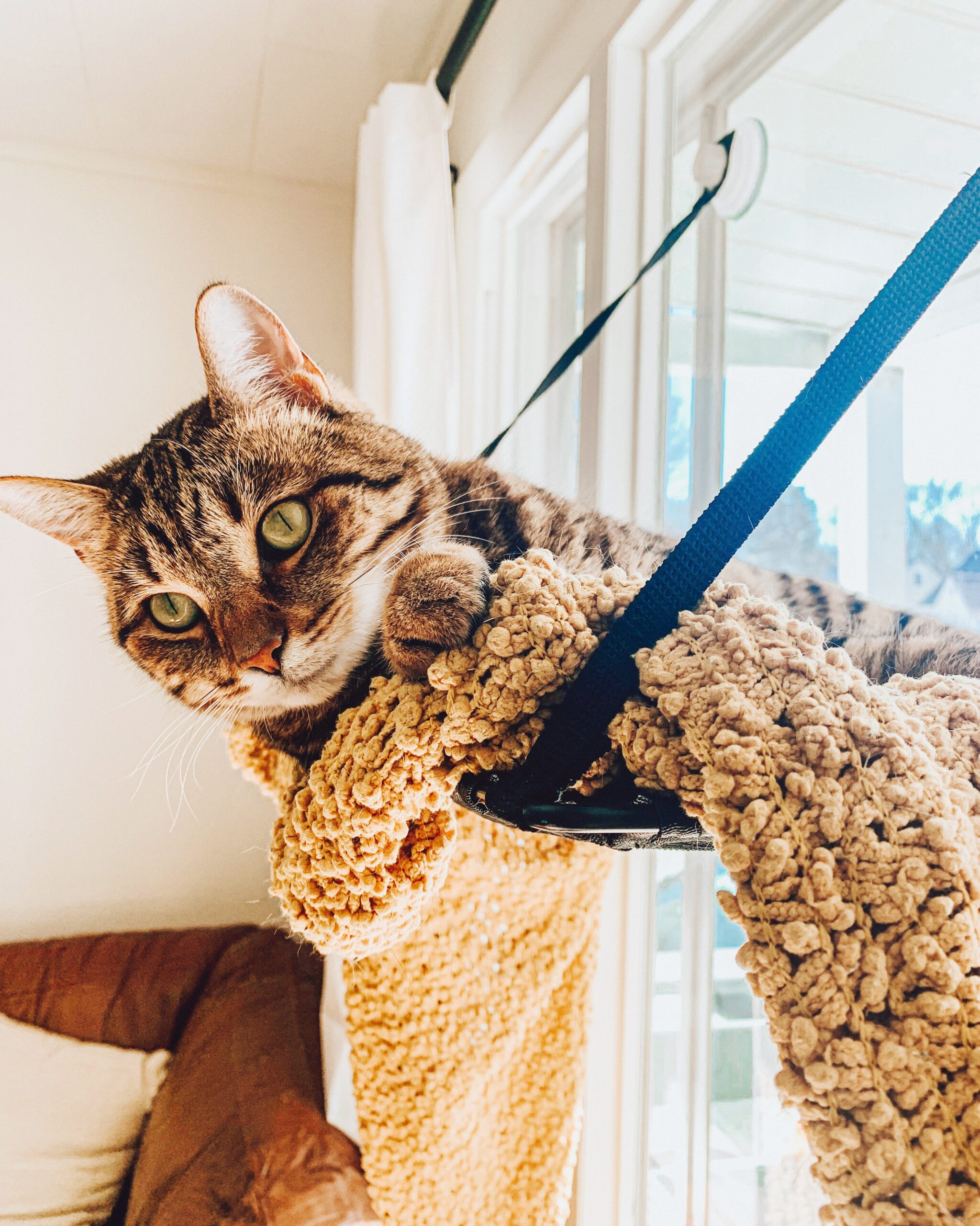 Folds up to window so blinds and drapery can function normally (if kitty lets you)