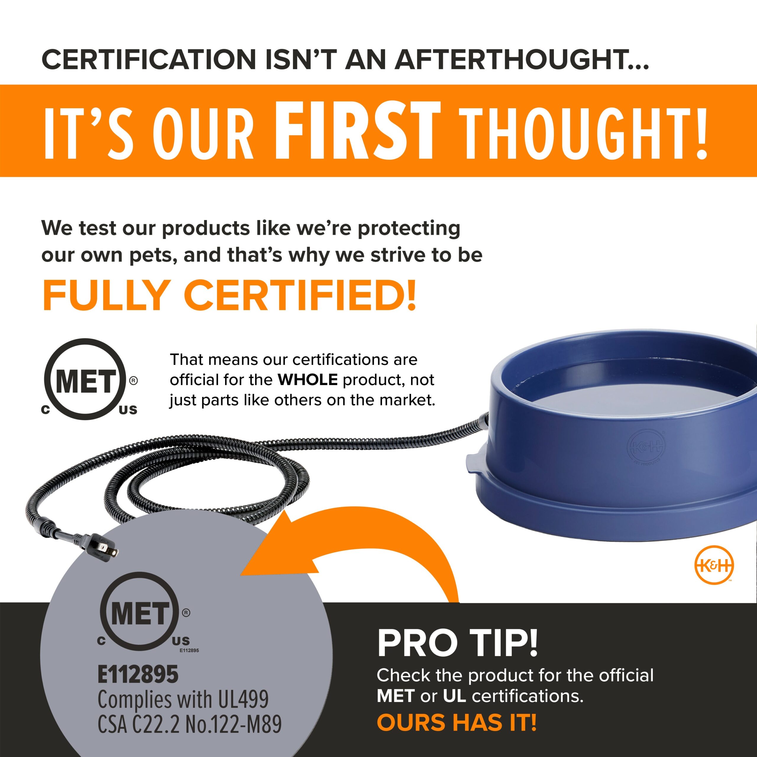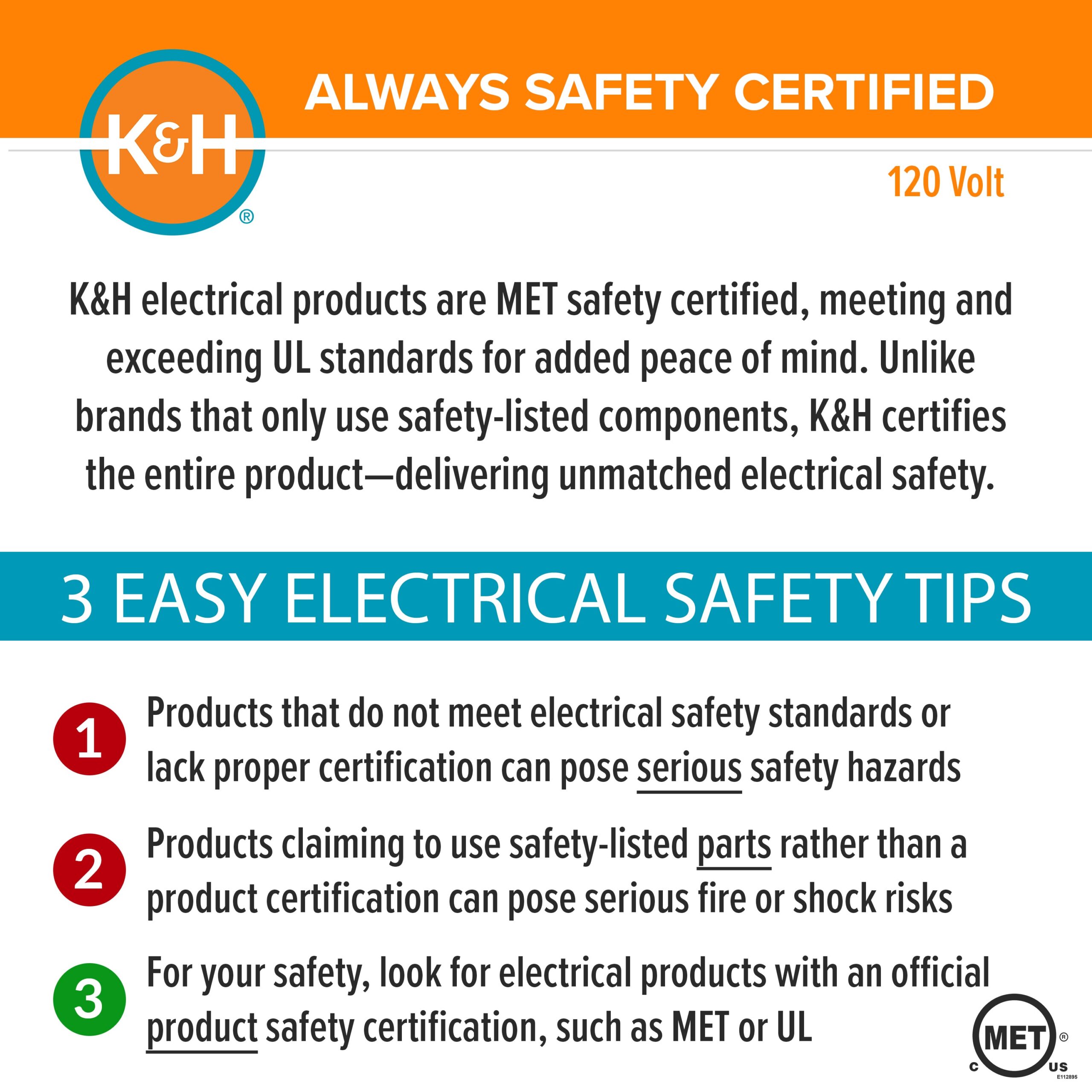 K&H products are safety certified, providing peace of mind with electrical safety standards that go beyond UL requirements; K&H doesn’t just use safety-listed parts, we safety certify the entire product, ensuring unparalleled safety