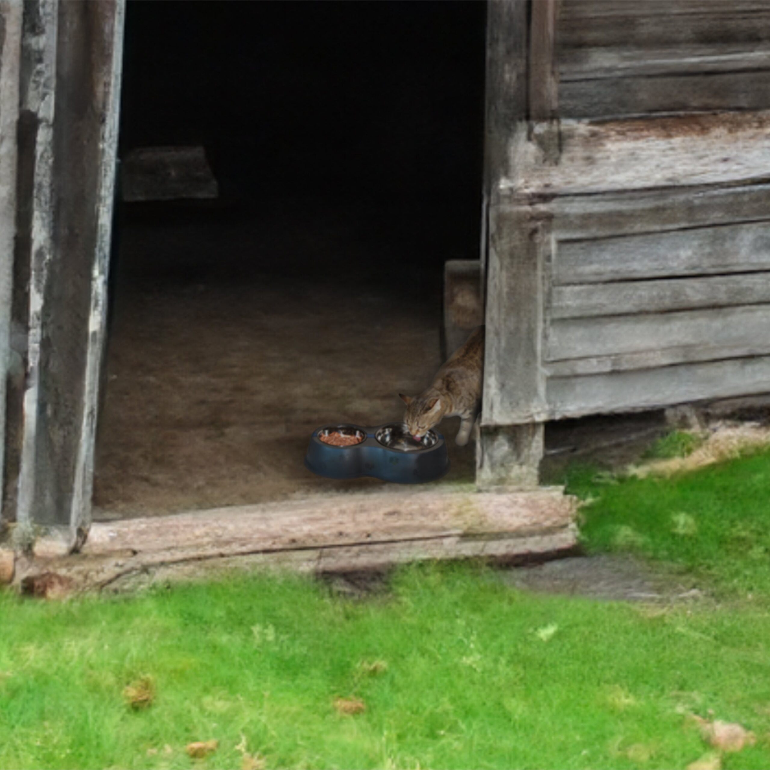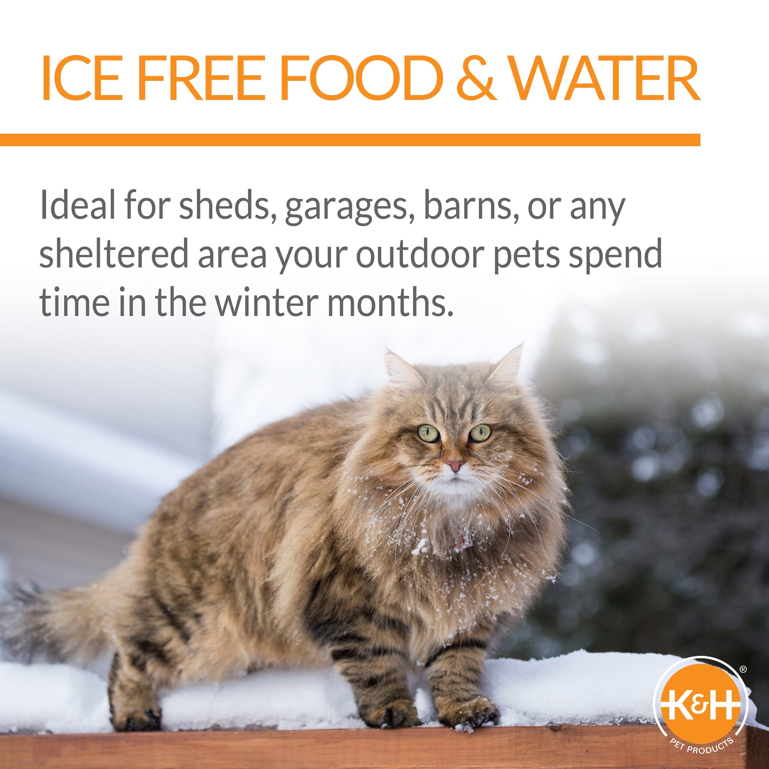 Thermostatically controlled to keep food and water from freezing even in sub-zero temperatures; we recommend placing in sheltered area (try our Outdoor Kitty Dining Room) to protect from wind, snow, and rain