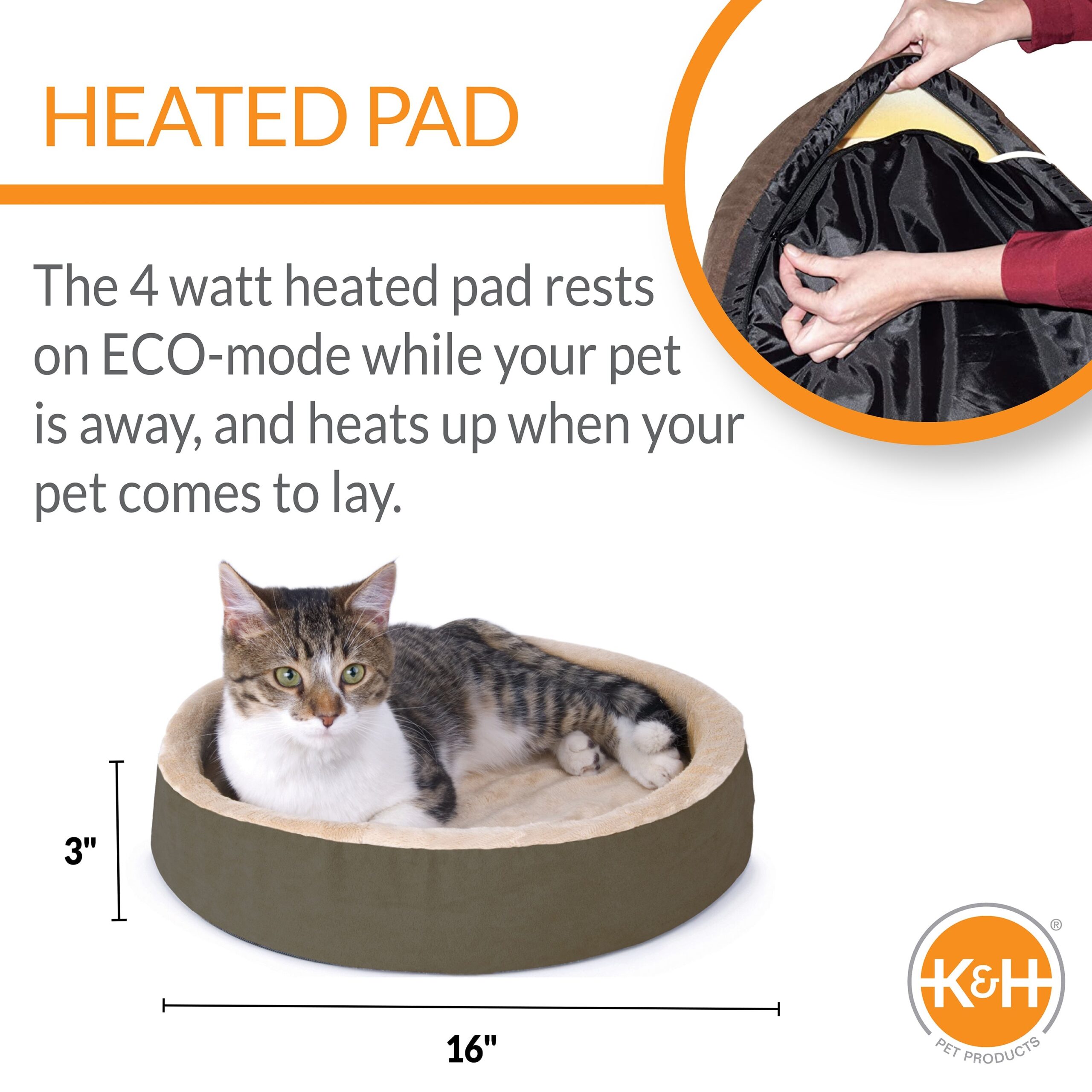 The K&H Thermo-Kitty Cuddle-Up measures 16” in diameter; perfect for cats and small dogs alike