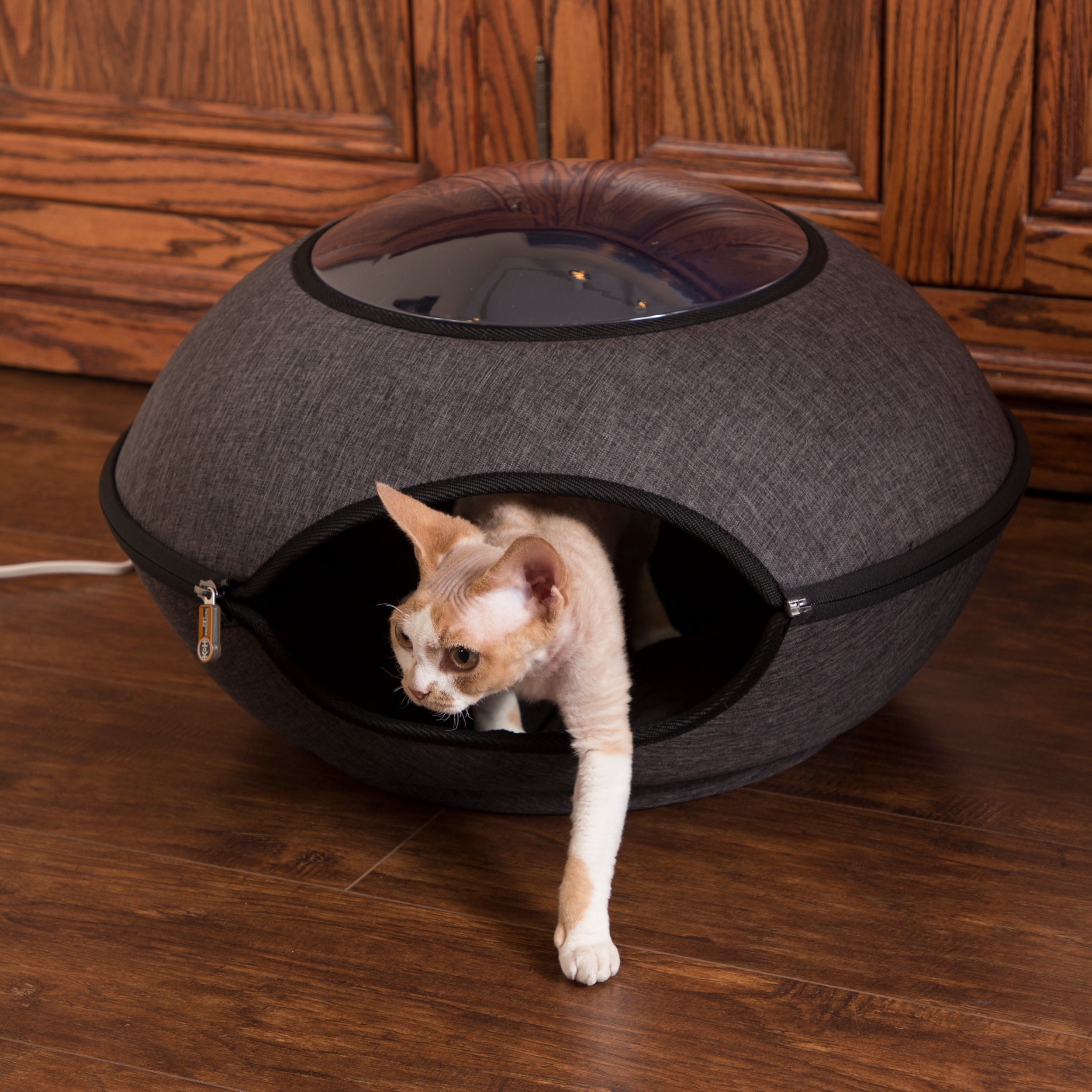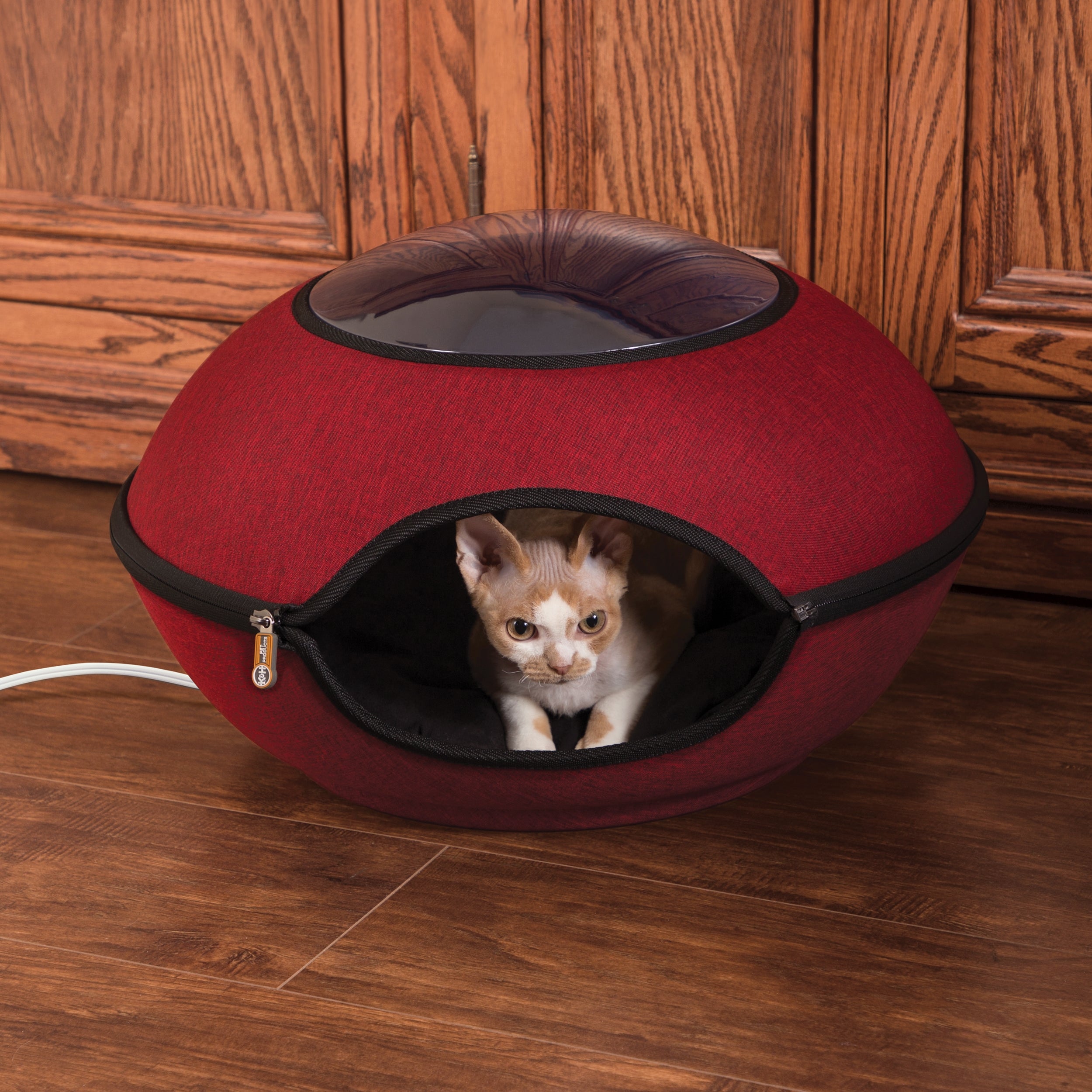 Heated pet bed provides low wattage gentle warmth and ultimate comfort in a modern cat cave with a window to peek through, great for cats and small dogs