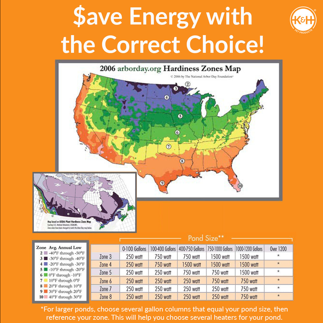 3 different wattages of pond deicers for outdoor ponds of virtually any size, see our Zone Chart for assistance in determining proper wattage